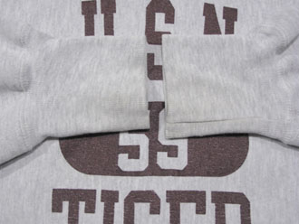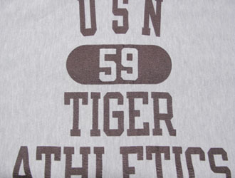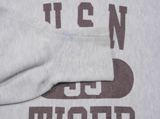 ダメージ: プリントにヒビ、袖口に汚れ、背面に若干のシミ