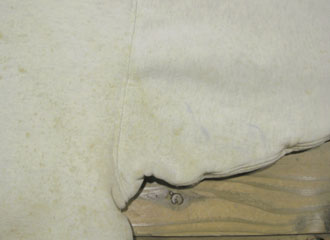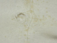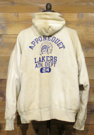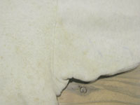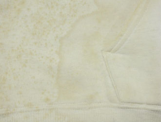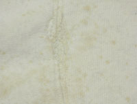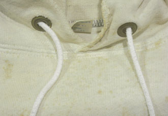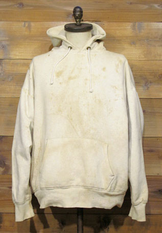 ダメージ: フード部分にリペアとダメージ、前身頃アームホールにリペア、袖口にダメージ、右肩付近にダメージ、全体にシミと汚れ