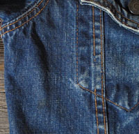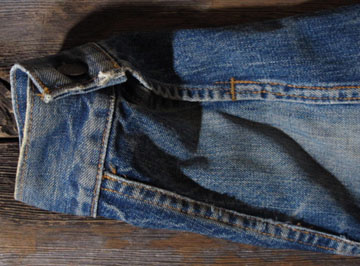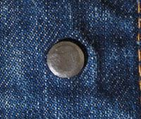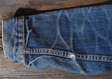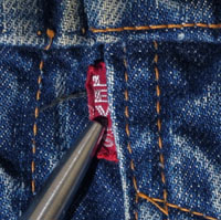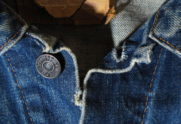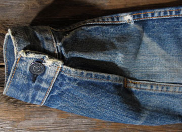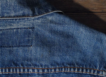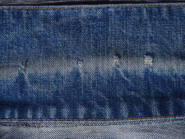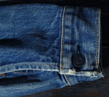 ダメージ: 全体に使用感とダメージとシミ、表記タグにダメージ、襟にスレによるダメージと薄汚れ、裾内側にステンシル、裾など所々に糸抜け