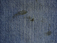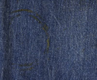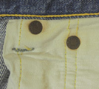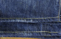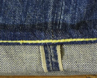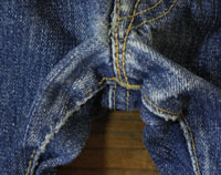 ダメージ: チェーンステッチで裾上げ済み、両面にシミと糸抜け、左背面にリペア