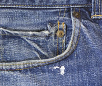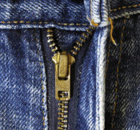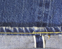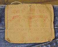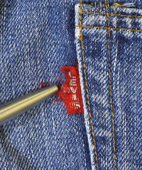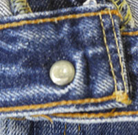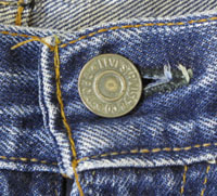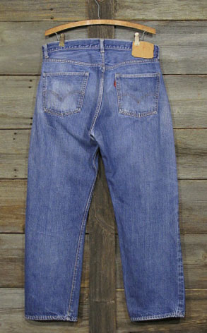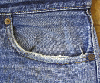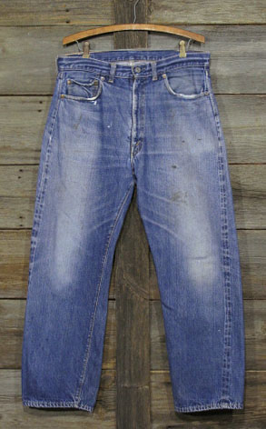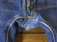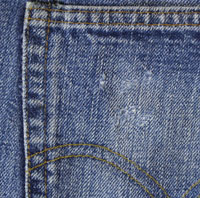 ダメージ: 両フロントポケットにリペア、前身頃にシミとペンキ痕、両膝に擦れ、両裾にほつれ、股にリペア、赤タブにダメージ、左バックポケットに擦れ