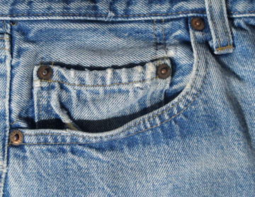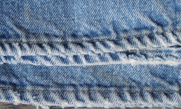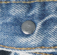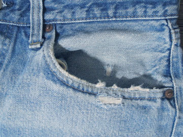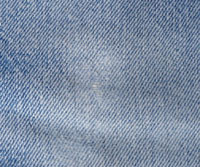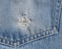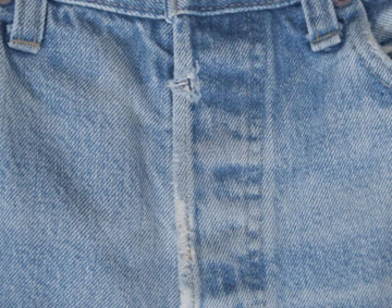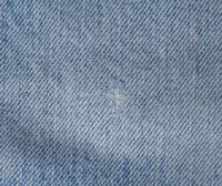 ダメージ: 所々にシミ、両フロントポケットや前立てなどにスレとダメージ、両腿上にスレによる小穴、左バックポケットにダメージ、両裾にスレとダメージと糸抜け