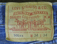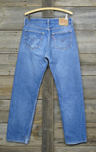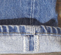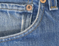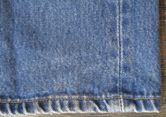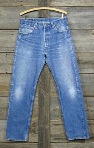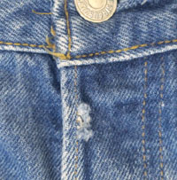 ダメージ: トップボタン下やコインポケットにほつれ、両膝付近や左裾など所々にシミ、膝部分の生地が薄くなっています