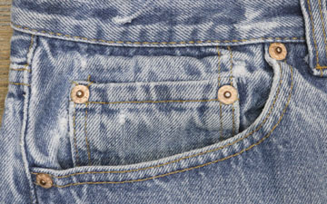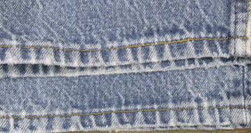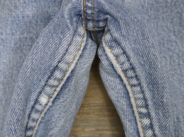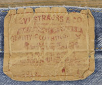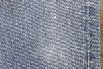 ダメージ: フロントポケット、股、裾などにスレ、左膝付近にスレによる小穴、薄い汚れ