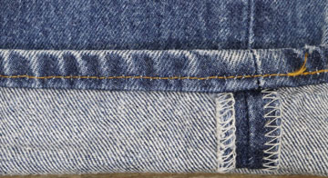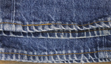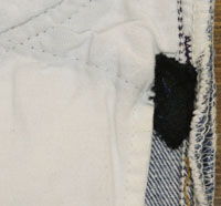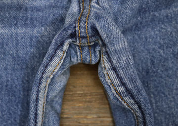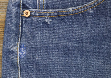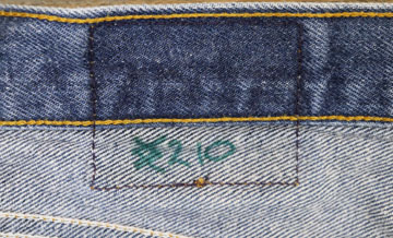 ダメージ: タグ内側に文字、内側表記タグ欠損、右ポケット付近に小穴とリペア、股にスレ